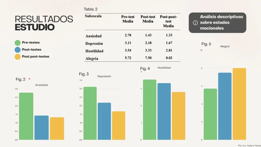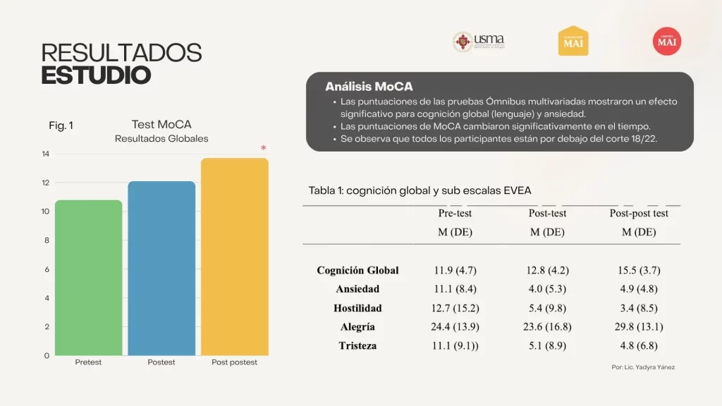 Los resultados mostraron cambios significativos en las áreas de cognición global, lenguaje y ansiedad, además de un aumento de la alegría y la socialización. La percepción de las sesiones fue altamente positiva, incluso entre residentes con deterioro cognitivo severo.